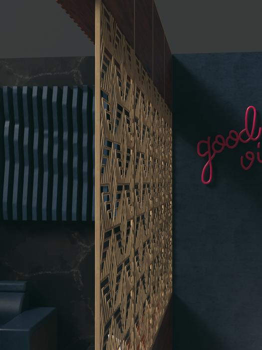 Inspired by parametric architecture, the Hallway Wall sets the tone for the entire workspace - balancing functionality and art in perfect harmony. The design allows sunlight to gently pass through from the offices behind, maintaining a sense of openness while preserving the privacy of employees. The wall will prominently feature the company logo or a series of logos provided by the client, showcasing brand identity in a striking yet elegant way. Integrated greenery adds a natural touch, breathing life into the hallway and creating a sense of calm as visitors and employees enter. The result is a sculptural, immersive experience that transforms a simple corridor into a signature moment of the business - both welcoming and purposeful.
